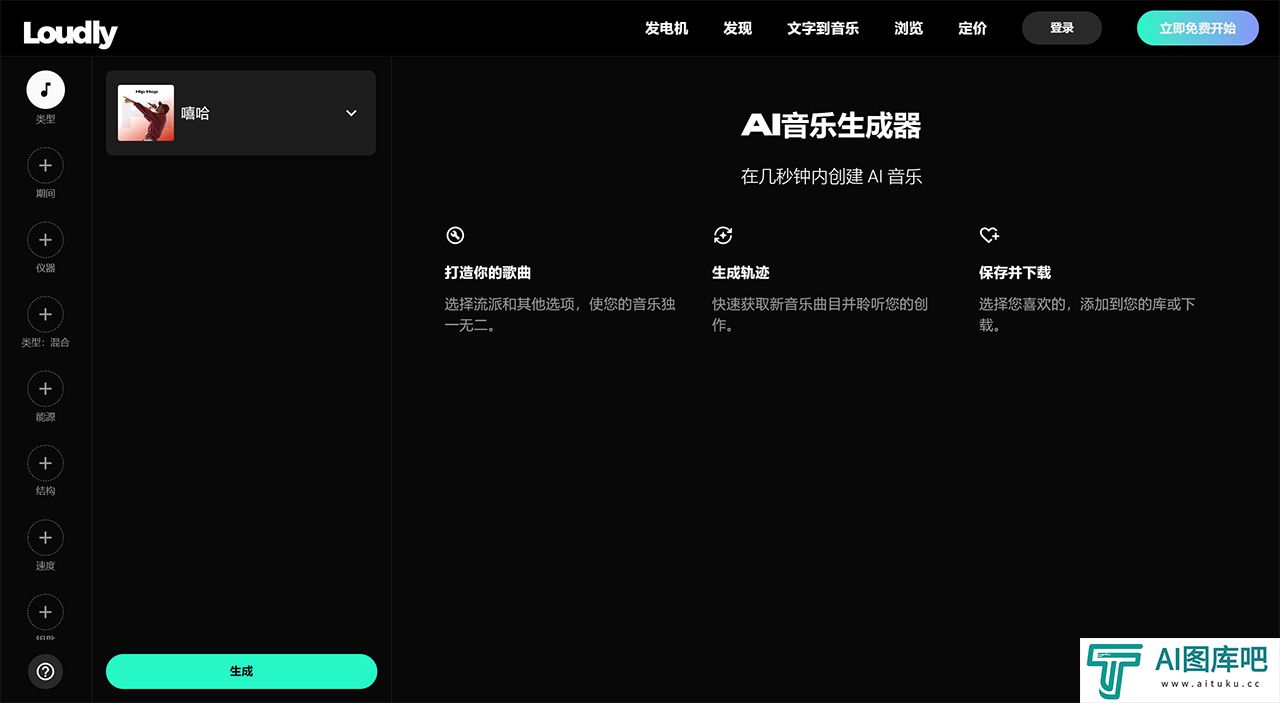 AI音乐生成: 选择流派和长度以创建原创曲调。