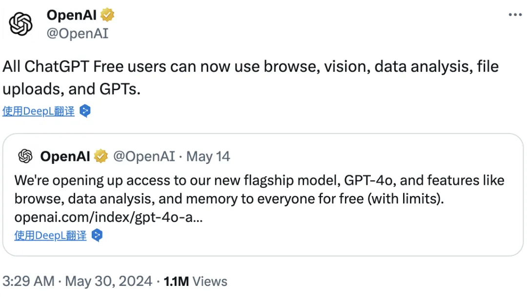 当地时间5月30日,OpenAI在推特(X)平台宣布,GPT-4o 多模态能力向所有用户免费开放,这些功能此前是ChatGPT Plus付费订阅用户才可以使用的功能。不过,在免费用户的使用次数上并没有明确提及,预计还是会是有一定次数限制。