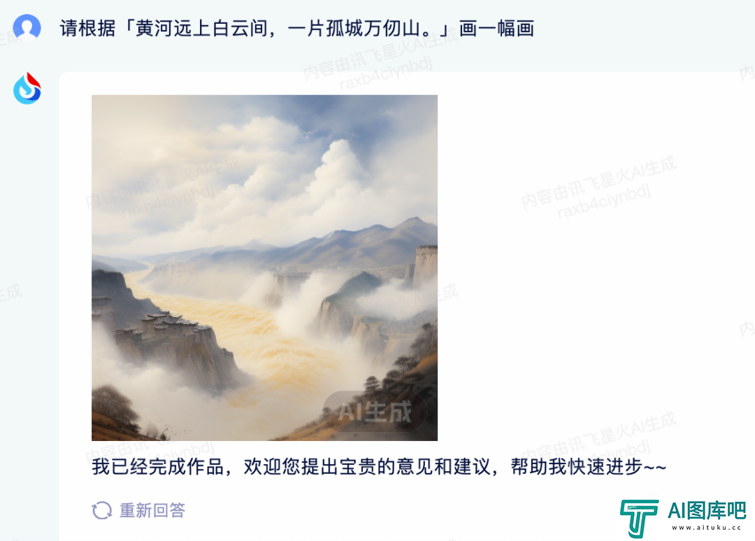 可以看到,讯飞星火绘制的画不仅理解来中文古诗词的内容,画风也是更具有古色古韵,而且巧妙地将黄河、白云和孤城在整个空间里组合在一起。